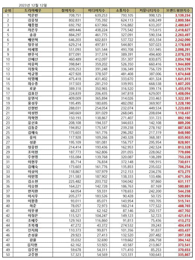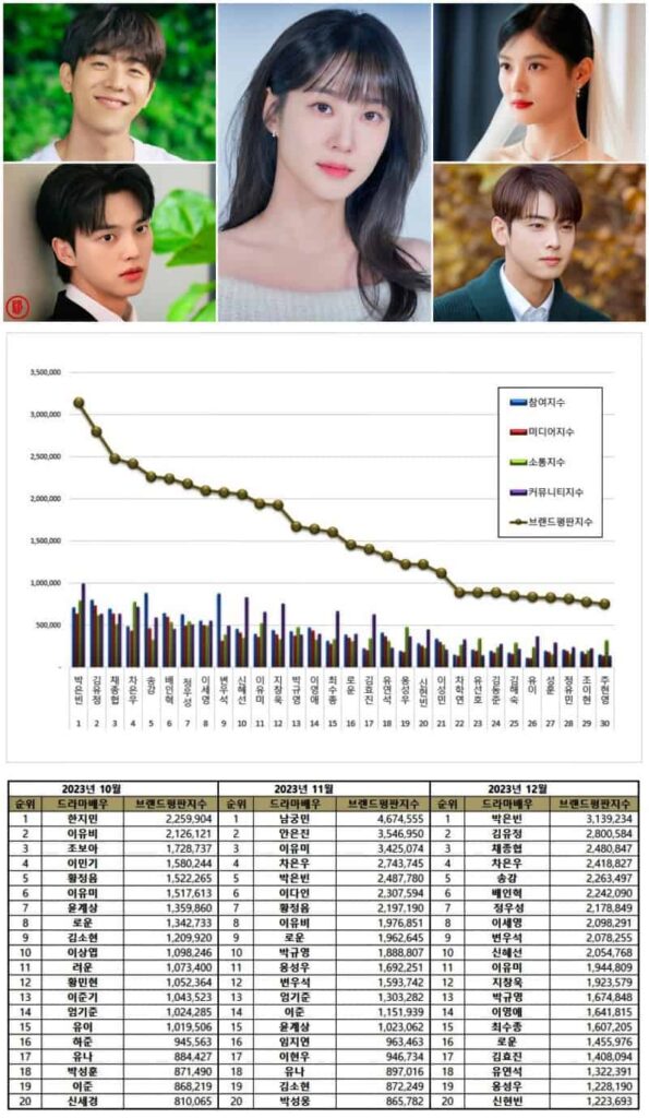 The Korean Business Research Institute conducted a comprehensive analysis of 57,887,666 data points from 50 Korean actors who appeared in dramas between November 12 and December 12, 2023. The Institute used this data to measure brand participation, media coverage, communication, and community indexes. Remarkably, the data points in December experienced an impressive increase of 3.52% compared to 55,917,667 in November.