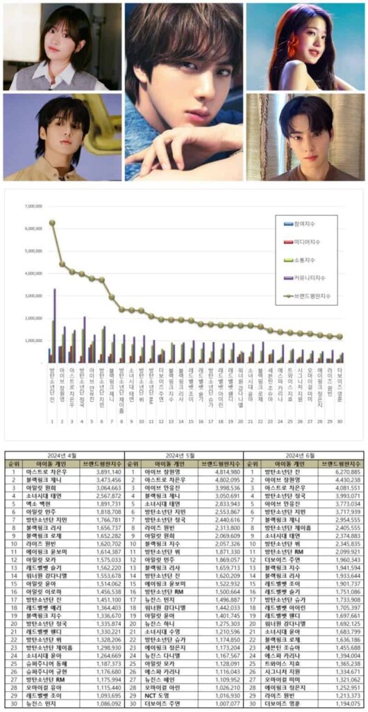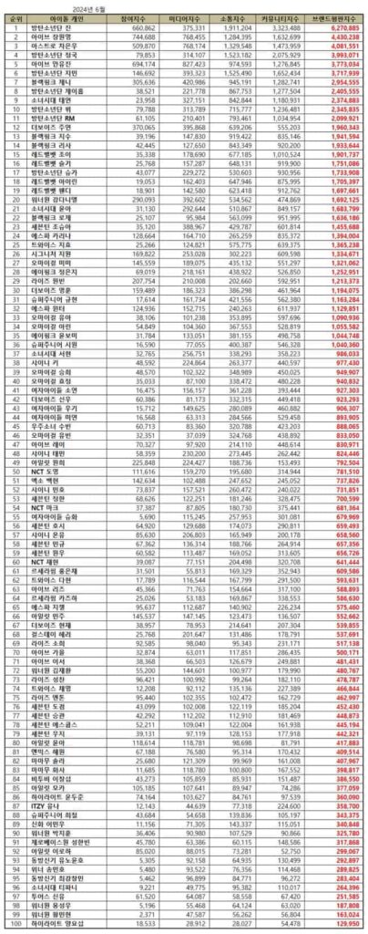 From May 29 to June 29, 2024, the Korean Business Research Institute analyzed the brand reputation index of individual idols. They extracted a total of 110,769,278 pieces of big data from 1,730 individual idol brands.