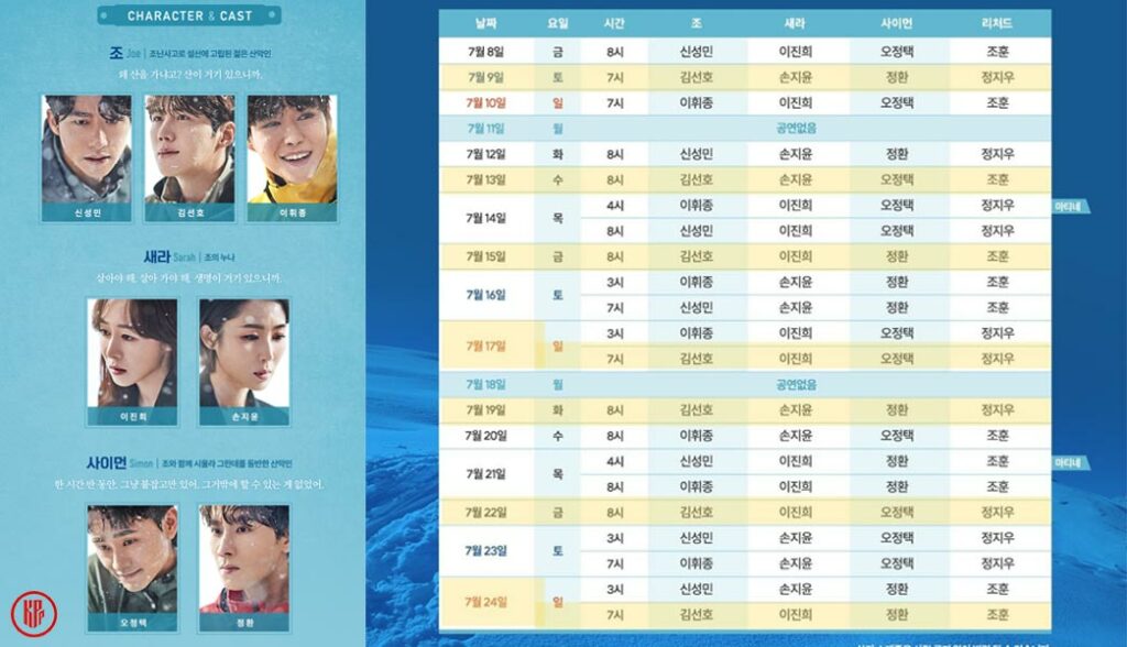 Along with Kim Seon Ho, talented prominent actors Shin Sung Min and Lee Hwi Jong will also play their own version of Joe Simpson. Furthermore, actors Oh Jung Taek and Jung Hwan has taken the role of Simon Yates, Joe’s partner on their mountaineering journey. Eventually, actresses Lee Jin Hee and Son Ji Yoon will also brighten the stage with their role as Sarah.