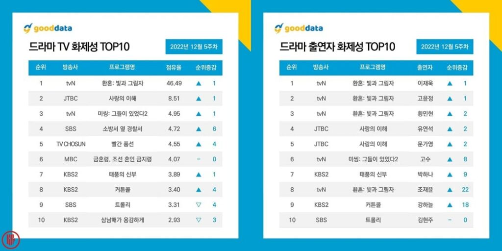 Check out the complete list of the weekly top 10 most buzzworthy dramas and actors for the 5th week of December 2022 by Good Data Corporation.