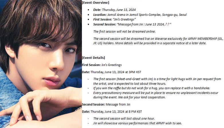 Officially called “Jin’s Greetings,” this event will feature two parts. The first part is an exclusive meet and greet with BTS Jin, where fans are allowed to hug BTS Jin just light enough if they win the raffle.