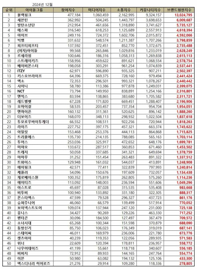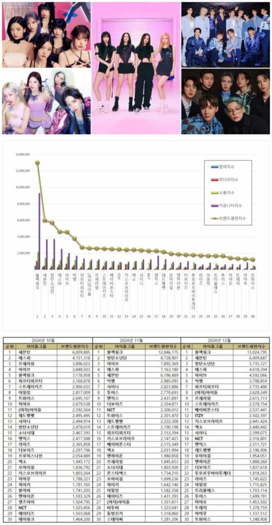 Please find below the thirty most popular Kpop idol group brand reputation rankings for October, November, and December 2024.