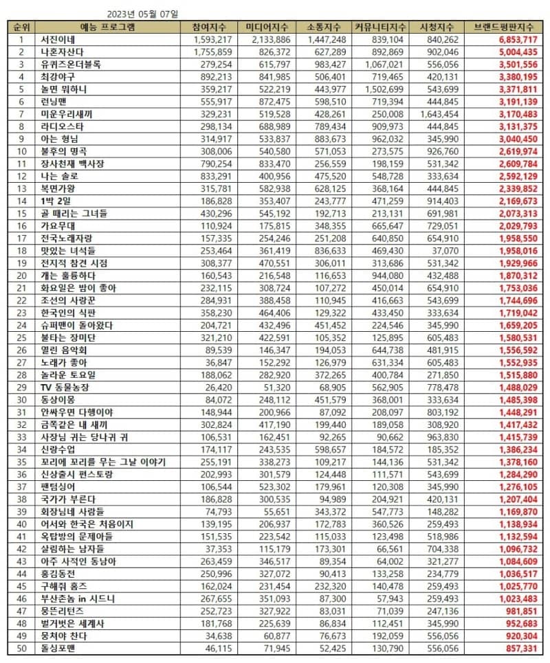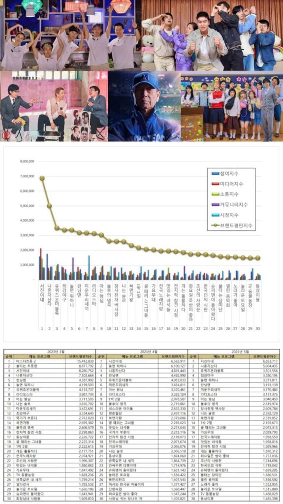 For May’s top list, the Korean Business Research Institute has analyzed 98,086,200 brand big data of Korean entertainment programs from April 6 to May 6, 2023. However, compared to 98,578,984 brand big data of Korean entertainment programs in April, it decreased by 0.50 percent.
