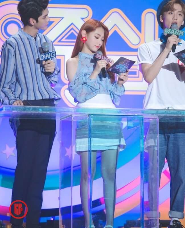 Dazzling as ever, Mina wore the same outfit while presenting on Kpop MBC’s Show! Music Core. During her stint as a host from 2018-2020, she frequently displayed a range of looks highlighting her innate charm as well as excellent choice of fashion in the Kpop show. The SEZWICK blouse’s soft blue hue perfectly complemented her radiant red-orange hair, enveloping her in a sophisticated and graceful aura.