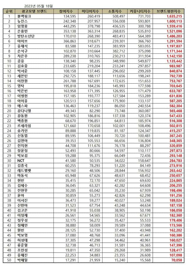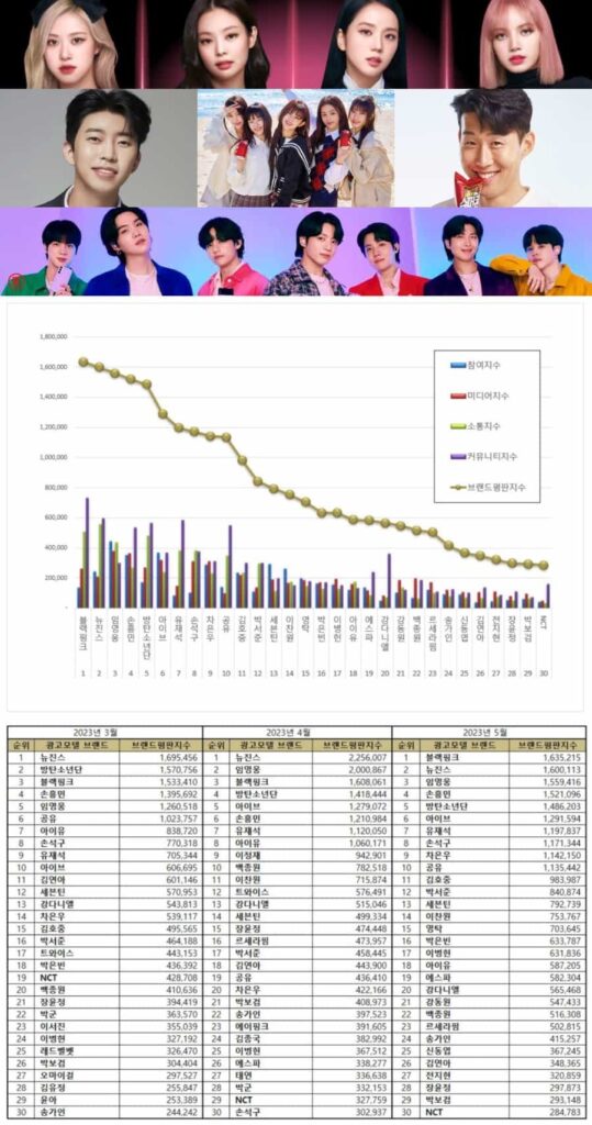 As a result, BLACKPINK climbed up to the No.1 spot on the list, followed by NewJeans, Lim Young Woong, Song Heung Min, and BTS, which completed this month’s top five list of Korean advertisement models.