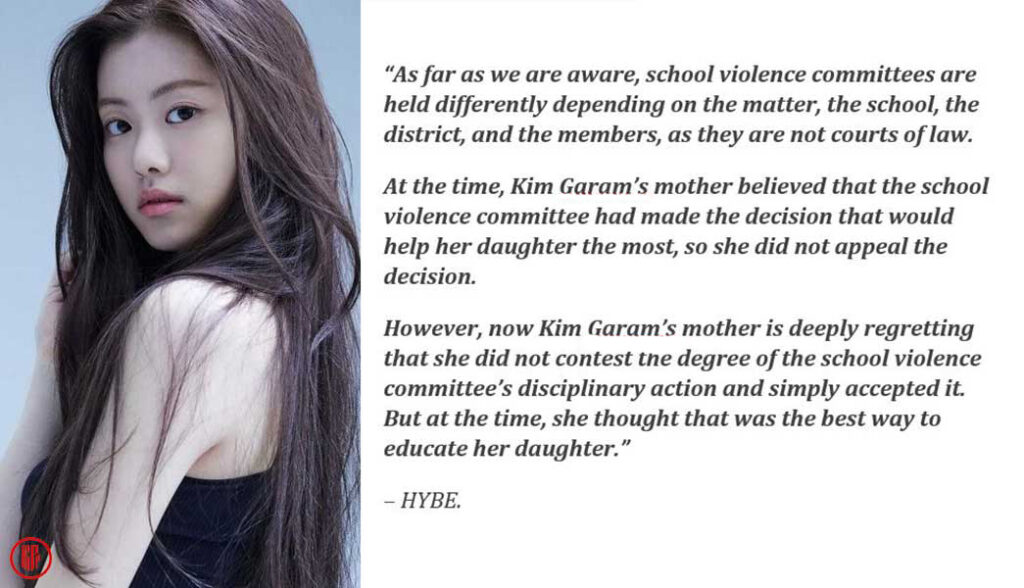 At the same time, the company stated that Kim Garam accepted the punishment without any violence involved. According to HYBE, at the time of the incident, Kim Garam’s mother believed that the decision was best to help her daughter. Therefore, she didn’t make any appeal.