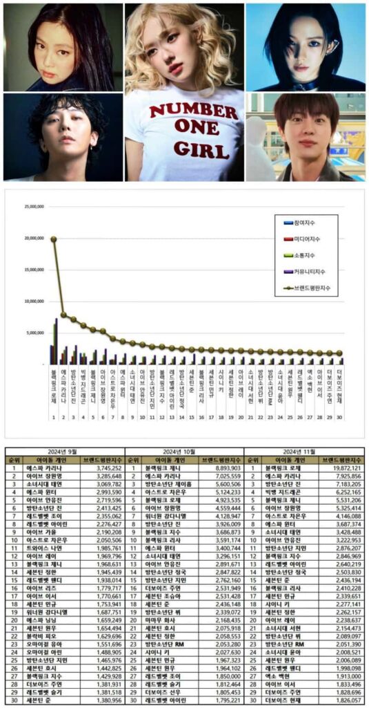 As a result, BLACKPINK Rosé, aespa Karina, BTS Jin, BigBang G-Dragon, and BLACKPINK Jennie secured the top five positions in the November 2024 individual Kpop idol brand reputation rankings.