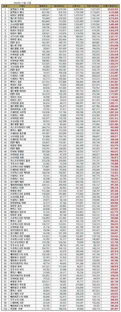 On November 17, the Korean Business Research Institute unveiled this month’s most popular female Kpop idols. Discover the top 100 individual Kpop girl group member brand reputation rankings for November 2024 below!
