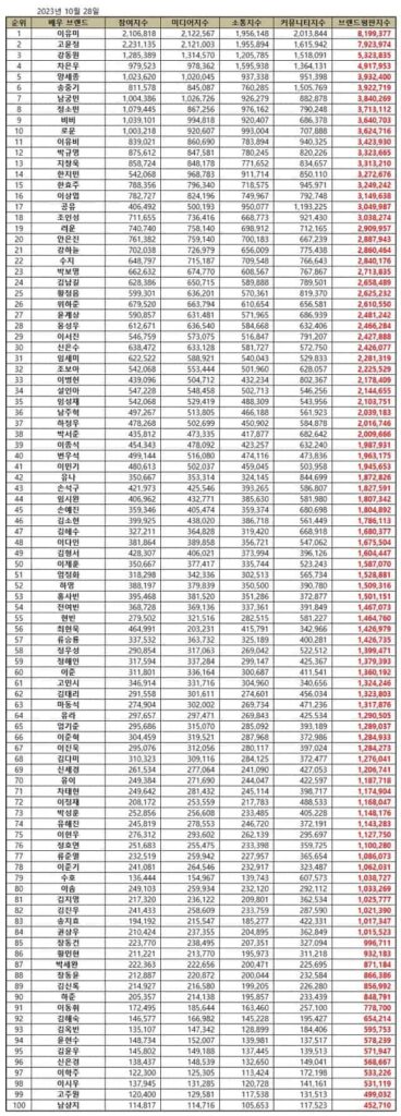 The Korean Business Research Institute has analyzed brand data for 100 actors in dramas, movies, and OTT shows that aired from September 28 to October 28, 2023. They measured consumer brand engagement, media volume, communication volume, and community volume and indexed them using the brand reputation algorithm. This data represents a 9.28% increase compared to the actor brand data from September, reaching 198,857,554.