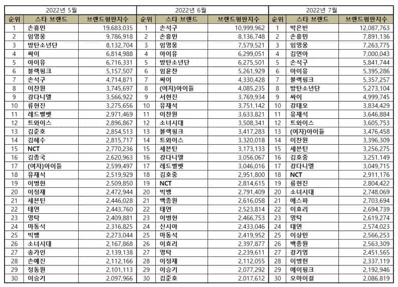 In addition, here is the list of the top 30 most popular Korean stars in May, June, and July 2022.