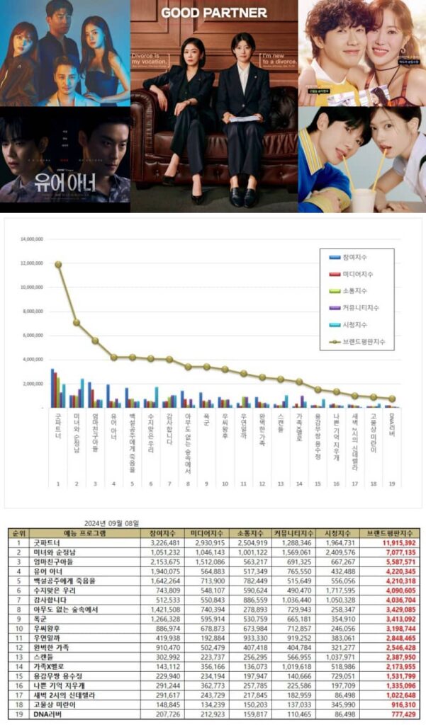 Starring top actresses Jang Nara and Nam Ji-hyun, SBS’s legal drama “Good Partner“ soared to first place on the list of most popular Korean dramas in September 2024, boasting a remarkable brand reputation index of 11,915,392.
