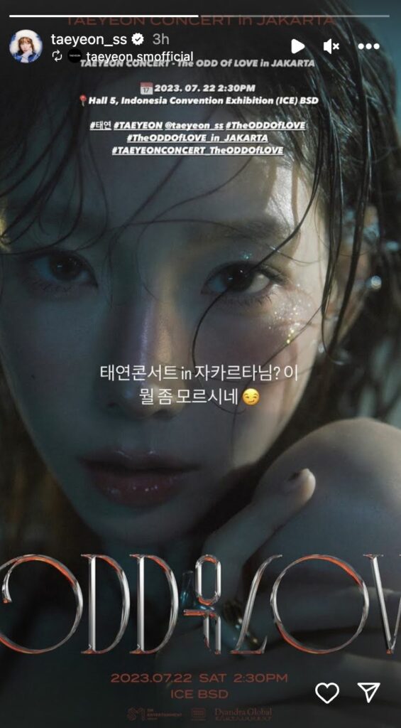 Although the singer didn’t explain clearly in her posts, fans speculate that she is throwing shade at the limited seat capacity in the venue. The Taeyeon Concert in Jakarta, titled the Odd to Love, will take place at Hall 5 in the Indonesia Convention Exhibition (ICE). What matters is that the hall can hold only up to 5,000 people.