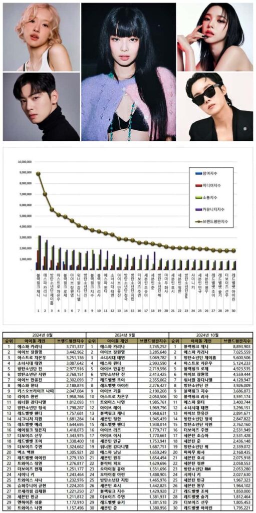Based on the results, BLACKPINK’s Jennie, aespa’s Karina, BTS’s J-Hope, ASTRO’s Cha Eun Woo, and BLACKPINK’s Rosé secured their places in the top five individual Kpop idol brand reputation rankings this month. Here are the 30 popular male and female Kpop idols from August, September, and October: