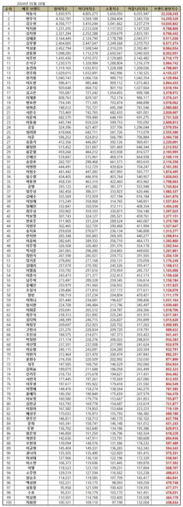 From April 28 to May 28, 2024, the institute analyzed 247,271,483 brand big data of 100 Korean actors and actresses featured in dramas, movies, and OTT platforms. Compared to the brand big data of 191,040,058 in April, it rose 29.43%.