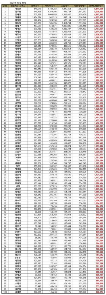 Prominent actor Hwang Jung Min, whose latest movie “Veteran 2″ remains at the top of the Korean box office, secured fifth place. His brand reputation index rose by 19.48 percent, increasing from 3,408,937 in September to 4,073,033 in October, with the following breakdown: