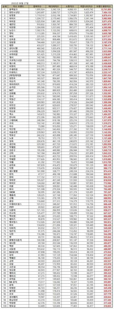 On August 27, the Korean Business Research Institute has released this month’s list of the most popular Korean singers. The institute has collected 158,503,807 singer brand big data from July 27, 2022, to August 27, to analyze the consumers’ brand participation, media, communication, and community. However, compared to the July singer brand big data of 136,447,458, it increased by 16.16 percent.