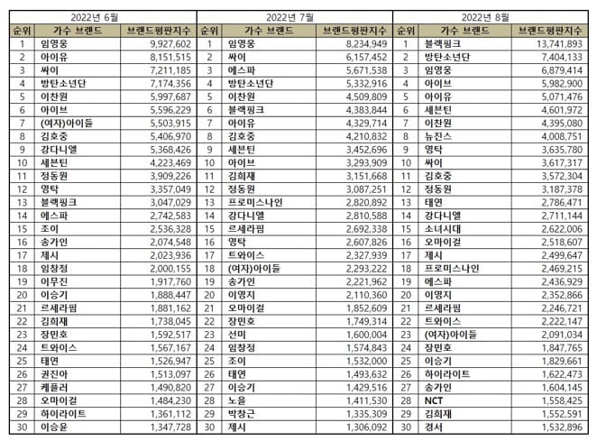 Check out the top thirty most popular Korean singers in June, July, and August 2022.