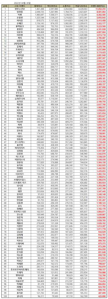 April Top 100 Most Popular Korean Star Brand Reputation Rankings