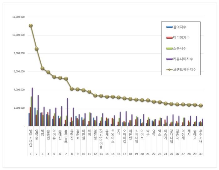 BTS’s brand reputation index increased by 32.22 percent, from 8,359,144 in March to 11,052,255 in April.