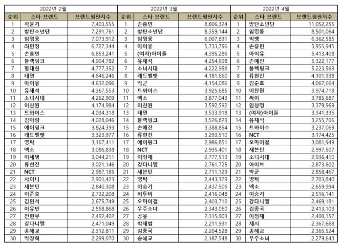 Check out the thirty most popular Korean stars below from February to April 2022.