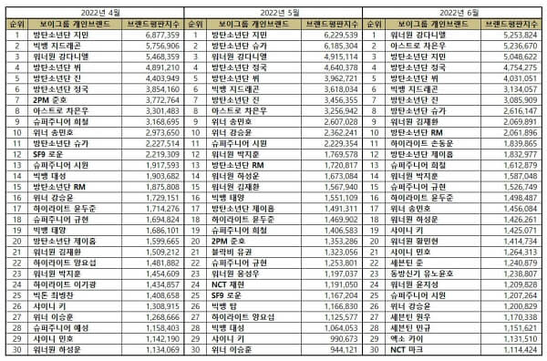 In addition, here are the 30 most popular individual Kpop boy group member brand reputation rankings in April, May, and June 2022.