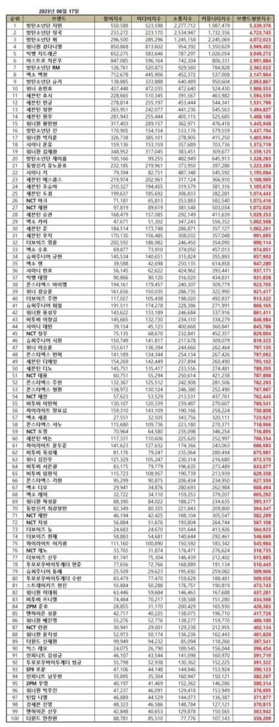 June 2023 Top 100 KPop Boy Group Member Brand Reputation Rankings