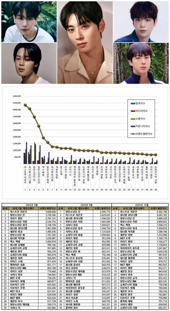 According to the result, Cha Eun Woo of ASTRO, Wanna One Kang Daniel of Wanna One, Jin of BTS, Jimin of BTS, and Baekhyun of EXO dominated the top five male Kpop idols in October 2024.