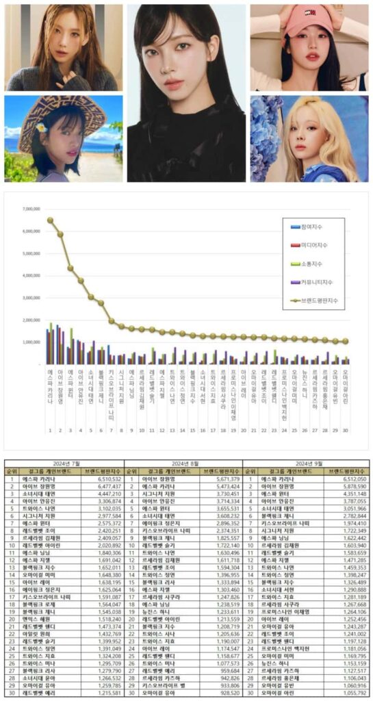 Taeyeon of Girls’ Generation, who recently collaborated on a new version of Sam Smith’s hit song “I’m Not The Only One” for its 10th anniversary edition featuring Korean verses, rose to fifth position this month. Despite climbing the ranks, her brand reputation index saw a decline of 15.42%, falling from 3,608,232 in August to 3,051,966 in September, with the following indexes: