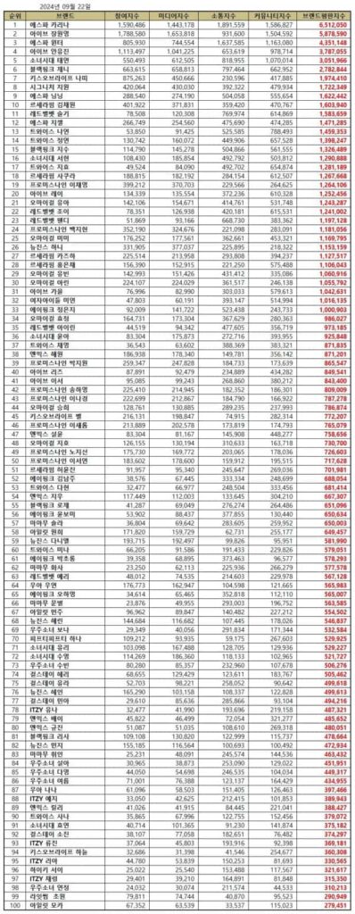 The Korean Business Research Institute extracted 100,242,961 brand big data of 675 individuals of the girl groups from August 22 to September 22, 2024, for the analysis of big data in September 2024. Compared to the 95,745,561 individual girl group member brands’ big data in August, it increased by 4.70%.