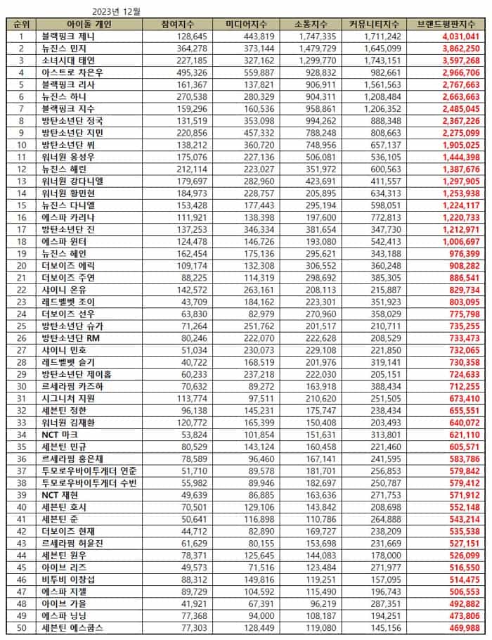 The Korean Business Research Institute analyzed 1,720 individuals from November 30 to December 30, 2023, in order to examine the big data of idol personal brand reputation. They extracted 59,686,378 pieces of Idol personal brand data, which marked a decrease of 28.32% from November’s 83,264,096 pieces of brand data.