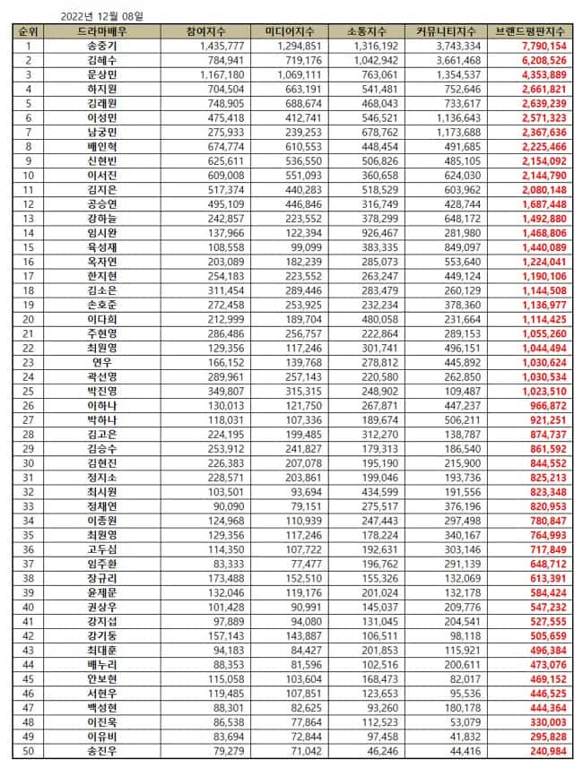 The Korean Business Research Institute has analyzed 70,106,285 brand big data of 50 drama actors who appeared in dramas that aired from November 8, 2022, to December 8, 2022. However, compared to 48,649,007 brand big data of drama actors last October, it increased by 44.11 percent.