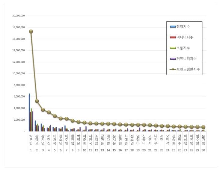 ENA’s “Extraordinary Attorney Woo” main leads, Park Eun Bin, Kang Tae Oh, and Kang Ki Young, became the most popular Korean drama actors this month. Park Eun Bin took the No.1 spot with an impressive brand reputation index of 17,304,704.