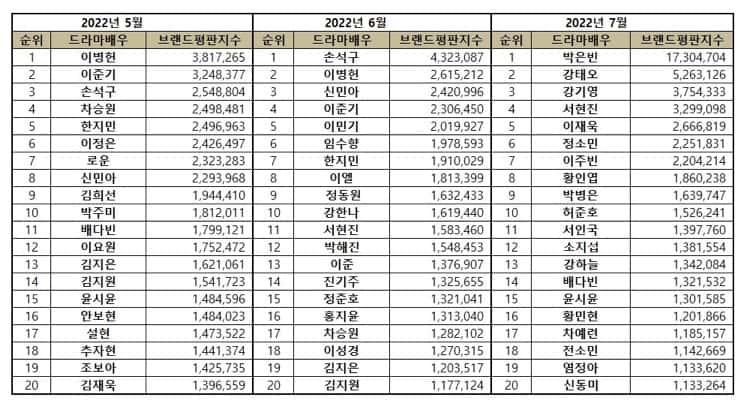 In addition, here is the list of the top 20 most popular Korean drama actors in May, June, and July 2022.