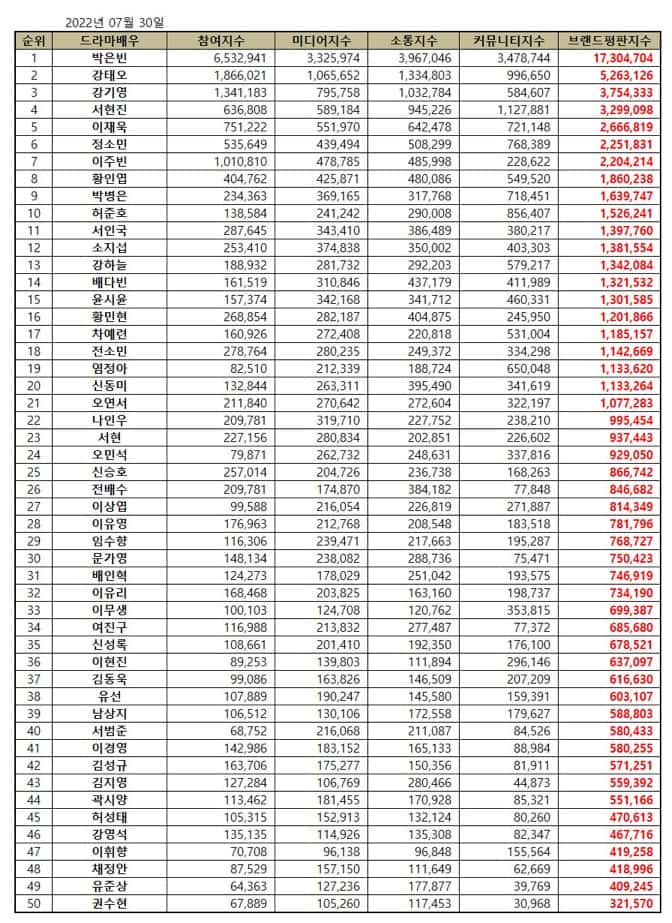 The Korean Business Research Institute has collected 74,419,618 data of 50 Korean drama actor brands appearing in dramas aired from June 30, 2022, to July 30, 2022. However, compared to drama actors and actresses’ big data of 57,138,259 in June, it decreased by 30.24 percent.