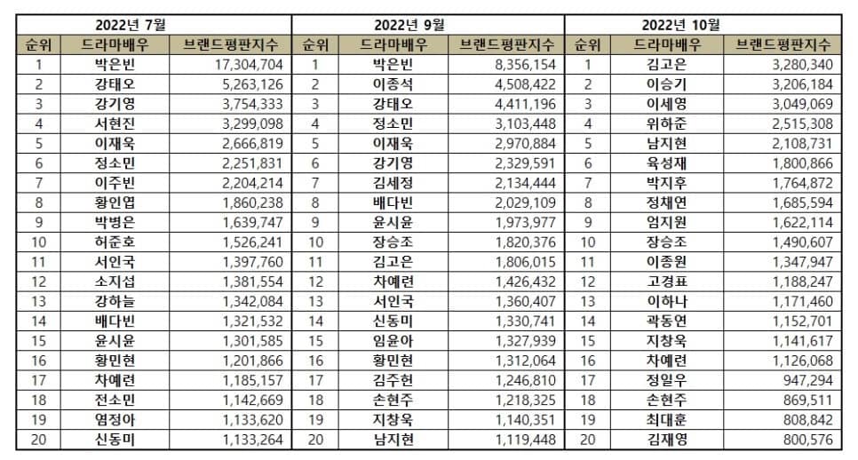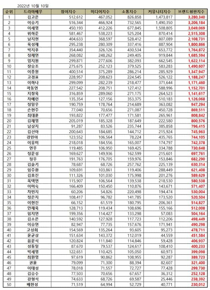 The Korean Business Research Institute has analyzed 67,876,551 data of 50 Korean drama actor brands appearing in dramas aired on September 10 to October 10, 2022. Compared to drama actors’ big data of 48,649,007 in September, it decreased by 28.33 percent.