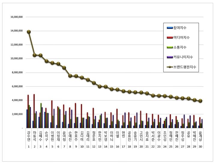 With a total index of 10,478,151, Ma Dong Seok ranked No.2 with a brand reputation rating of 10,524,326, and Kim Hye Soo ranked No. 3 with a total index of 10,478,151. Meanwhile, Son Suk Ku climbed to No.4 with a brand reputation index of 9,635,599, and Lee Byung Hun ranked No.5 with a total score of 9,380,105.