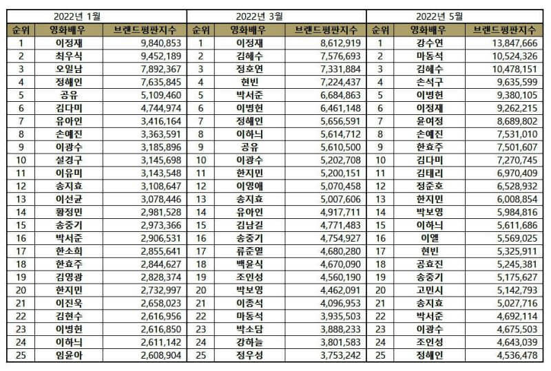 Below are the top 25 most popular Korean movie stars in January, March, and May 2022.