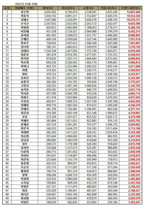 Top 50 Korean Movie Star Brand Reputation Rankings in May 2022. | Brikorea.