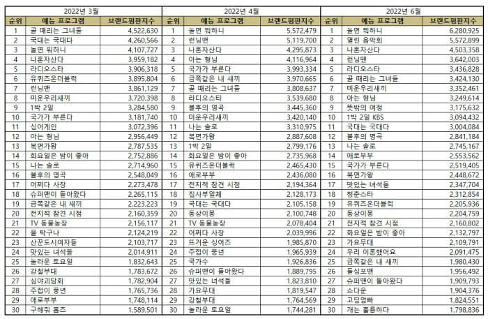 Here is the list of the top 30 most popular Korean variety shows in March, April, and June 2022.