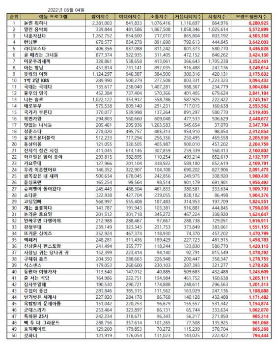 On June 4, the Korean Business Research Institute has published the top 50 most popular Korean variety show brand reputation rankings for June 2022.