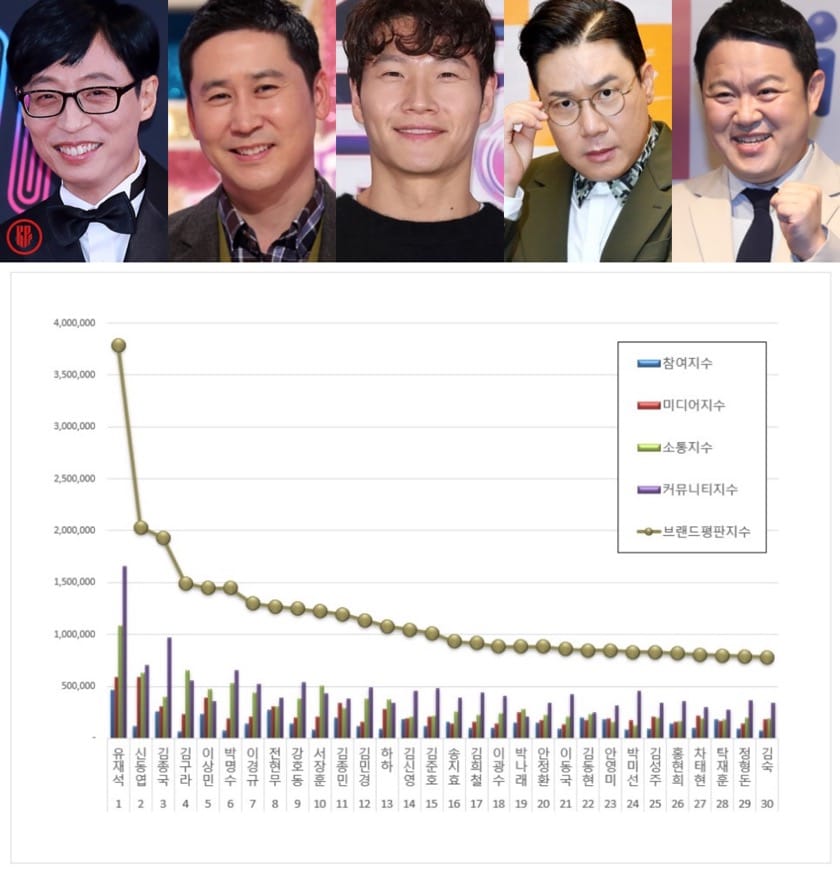 As a result, the top five Korean variety stars in February 2023 are Yoo Jae Suk, Shin Dong Yup, Kim Jong Kook, Kim Gu Ra, and Lee Sang Min.