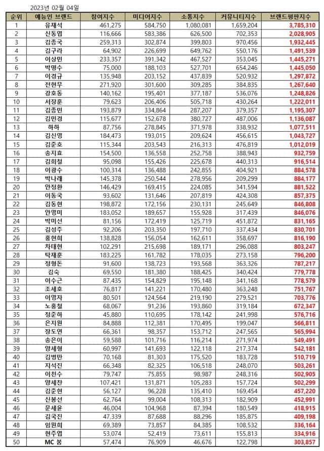 The Korean Business Research Institute has collected and analyzed 45,763,935 big brand data of 50 variety stars from January 4 until February 4, 2023. However, compared to the 46,376,052 brand big data of variety stars in January, it decreased by 1.32 percent.