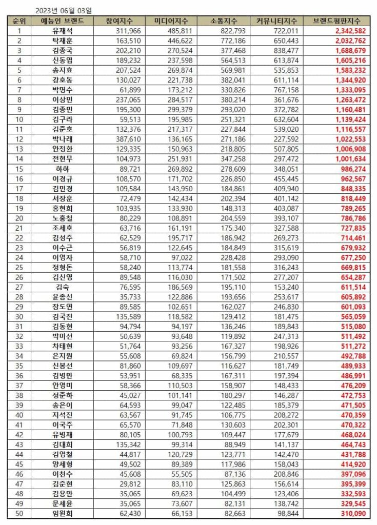 The Korean Business Research Institute collected and analyzed 40,253,232 data points related to the brands of 50 Korean Variety stars between May 3 and June 3, 2023. This represents a 6.92 percent increase compared to the 37,647,001 data points collected in May.
