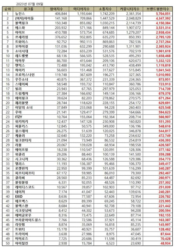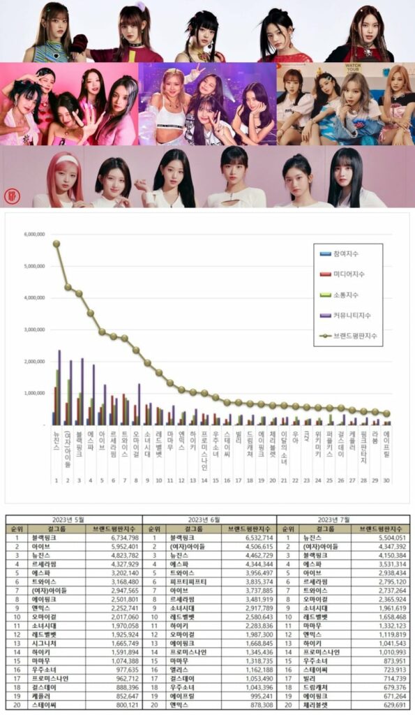 On July 9, the Korean Business Research Institute announced this month’s most popular Kpop female groups. The institute determined the rankings by thoroughly analyzing 50,549,740 Kpop girl groups’ brand big data collected from June 9, 2023, to July 9, 2023. However, compared to 65,730,391 girl group brand big data last June, it decreased by 23.10 percent.
