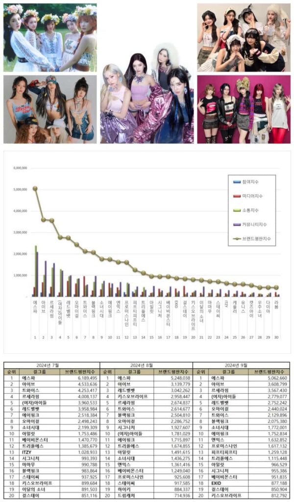 The Korean Business Research Institute analyzed 50,882,200 brand big data of Kpop female idol groups collected from August 15 to September 15, 2024. This analysis measured brand reputation indexes for Kpop female groups based on participation, media, communication, and community indexes. Compared to August’s 50,762,506 brand big data, the number shows a 0.24% increase.