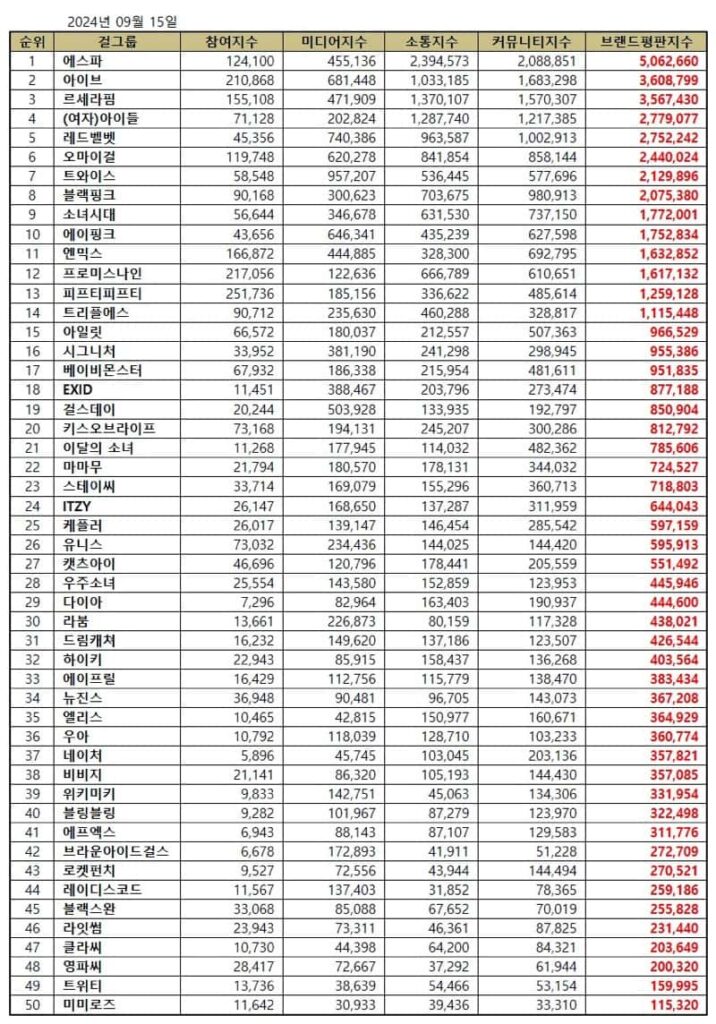 September 2024: Top 50 Kpop Girl Group Brand Reputation Rankings