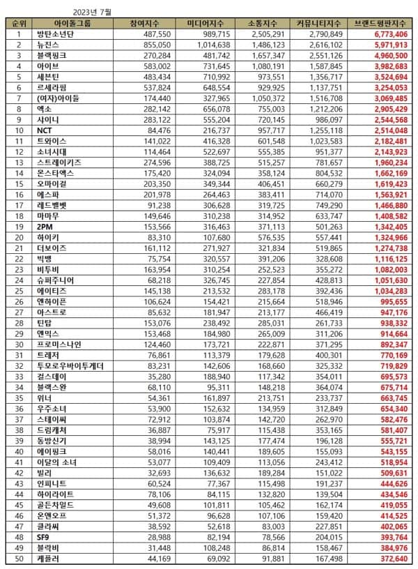 Top 50 Kpop Idol Group Brand Reputation Rankings in July 2023.