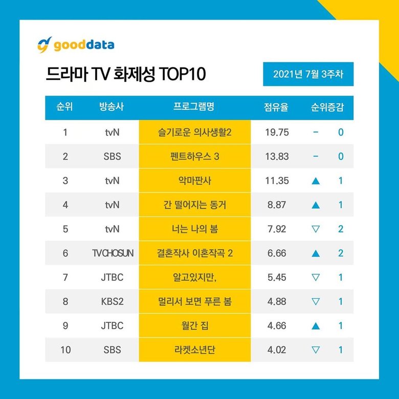 On July 6, Good Data Corporation has released the Top 10 Most Popular Korean Drama and Actor Rankings, which talked about the most in the 3rd week of July 2021. ‘Hospital Playlist 2’ remained on the first rank, followed by “Penthouse 3” on the second rank for the most popular Korean dramas that most talked about on the third week of July. At the same time, ‘The Devil Judge’ cast, Ji Sung, became the most popular Korean drama actor who talked about the most on the third week of July 2021.