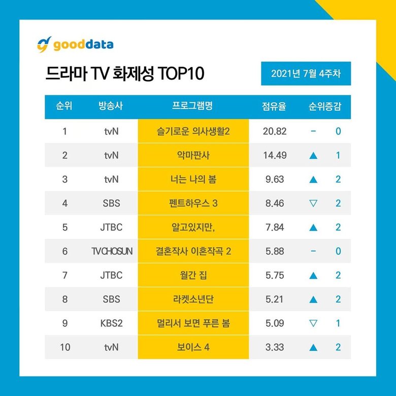 Good Data Corporation has analyzed ongoing and scheduled Korean drama from July 20, 2021, to July 26, 2021. After analyzing netizens’ responses from news articles, blogs, communities, videos, and SNS, the corporation published the result on July 27.