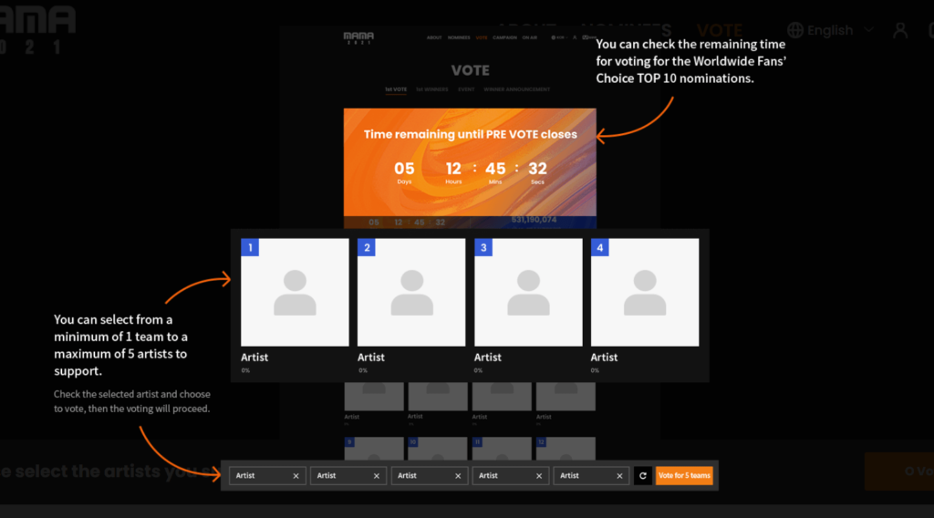3. After logging in, you can vote for your favorite artists. You are allowed to vote for 5 artists.